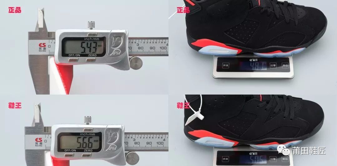 最后,对比数据,内底厚度测量,正品:5.43mm,鞋匠:5.66mm,单鞋重量,正品:481g,鞋匠:505g。