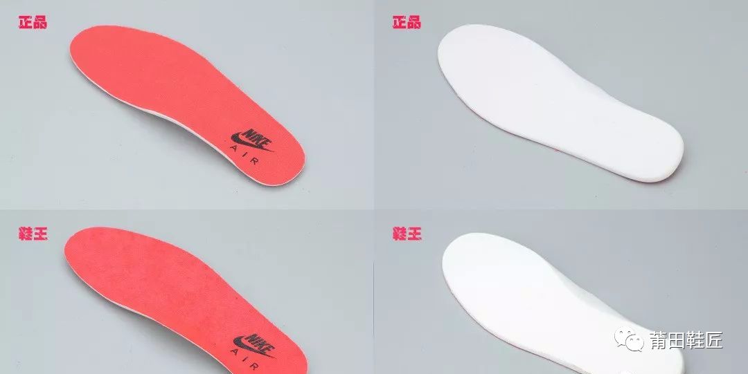 鞋垫正面是大红色绒布的纹理,鞋跟处是一个黑色的NIKE AIR印花,背面是纯白色的,正品颜色比鞋匠家的更鲜明,其他的没有差距。