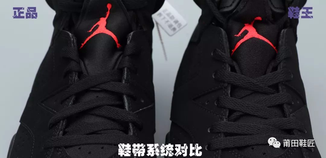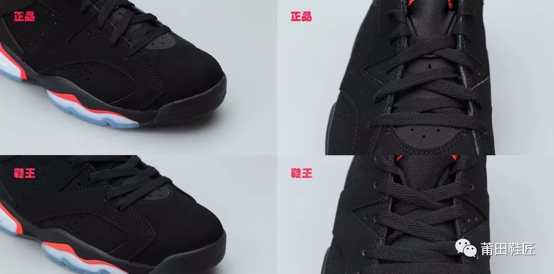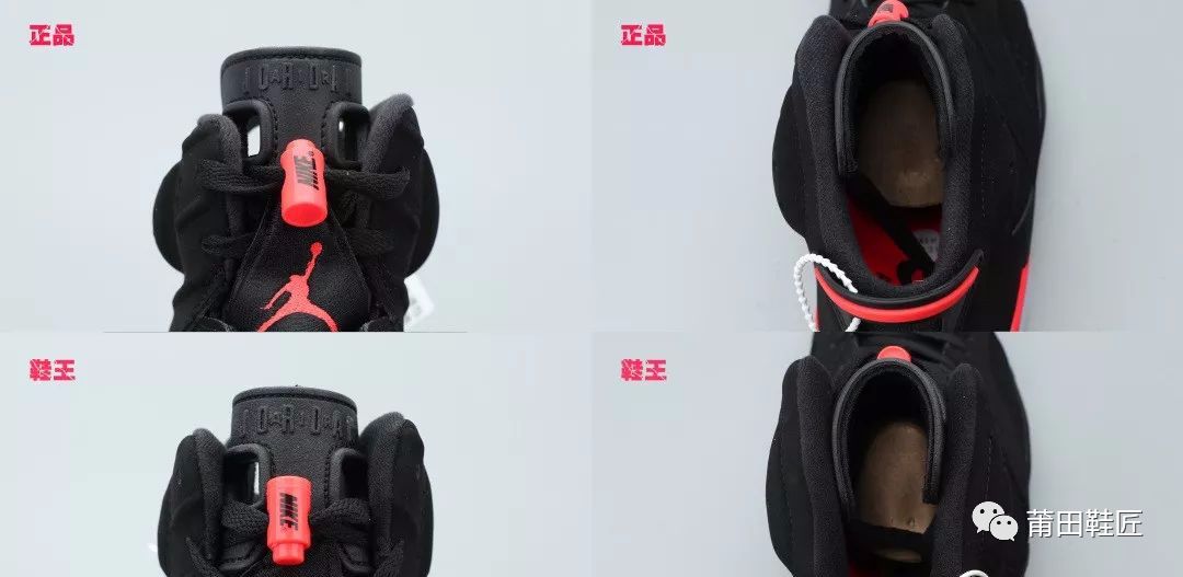 从对比图上可以看出,在鞋带部分,除了正品的颜色比鞋王的颜色更亮外,没有什么区别,做工也非常讲究。鞋带系统的对比基本上是一样的,但正品看起来更加有质感。