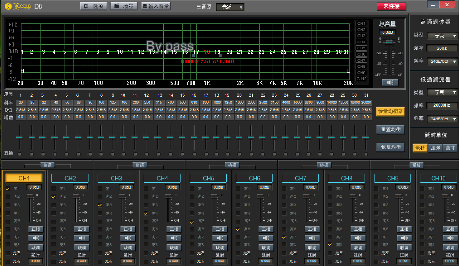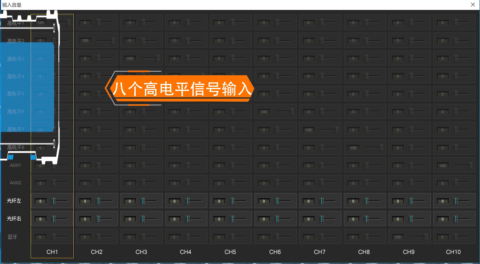 卓美的主界面基本是国产类通用界面,音量有8个高电平信号输入和2个AUX输入、2个光纤输入、蓝牙输入。它这台DSP同时可以做混频的作用,软件非常的简单。