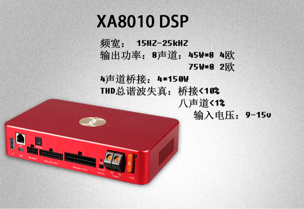总结一下:如果你在玩前声场三分频后声场同轴的话,你后面的低音炮可以做一个信号的输出不需要另外再加一个DSP。如果是前声场两分频再用后面的一个同轴的话你还有两路的信号可以做桥接而不需要你再加一个低音炮的喇叭,这也是非常方便的。这个卓美XA8010 DSP的玩法和它应用的方案非常的广,适合大部分车安装,即便放在扶手箱也可以。机身自带散热风扇安全性更高。