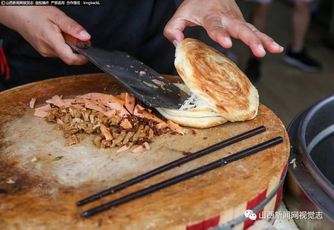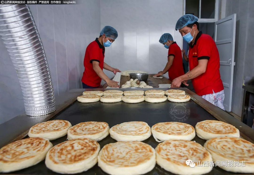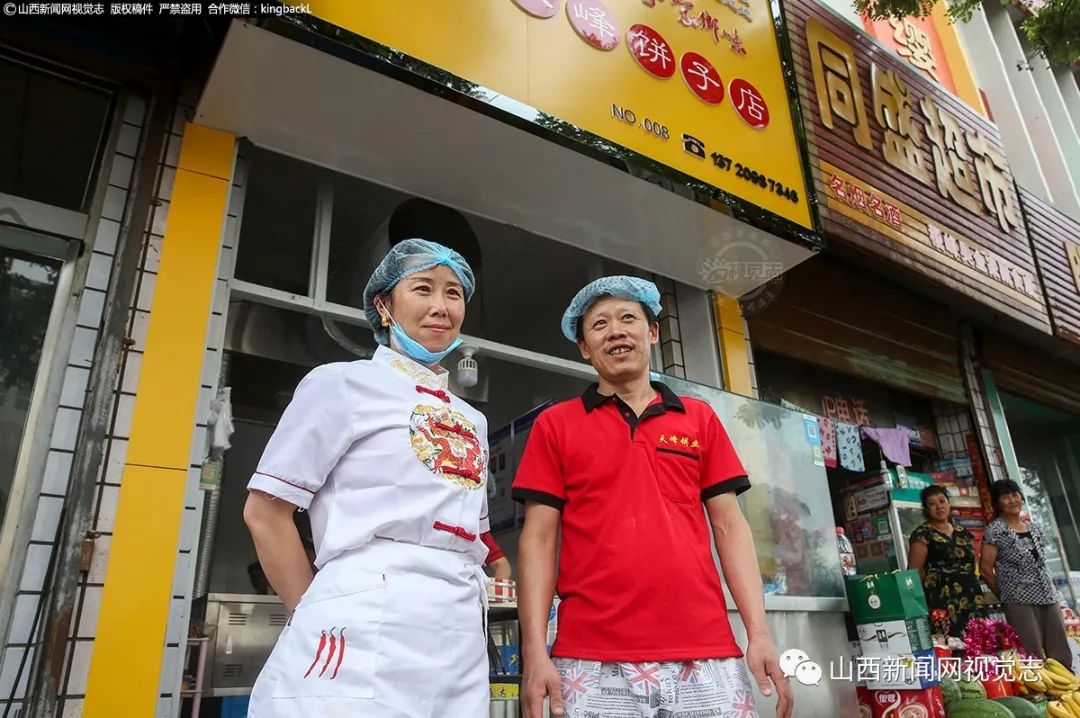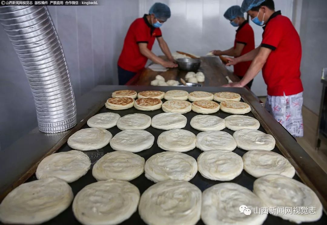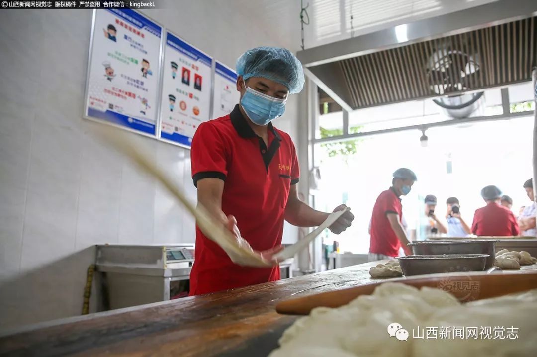 统一着装的员工,干净整洁的环境,整改后的店貌焕然一新。案板上飞舞的面片薄如蝉翼,这是稷山饼子的传统特色。