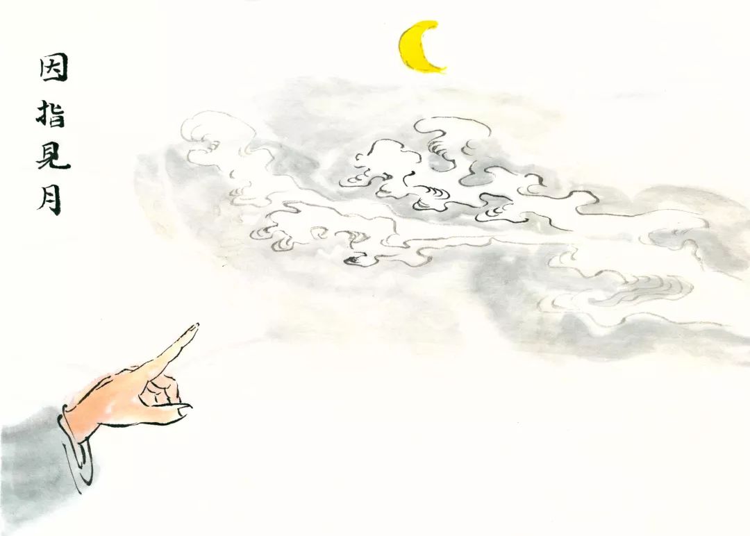 如《楞严经》卷二中,佛陀对阿难尊者谆谆教诲到:“如人以手,指月示人,彼人因指,应当看月”。