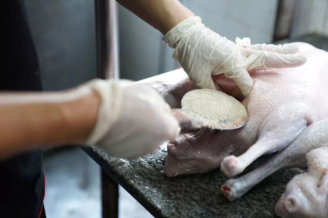 脱好毛的鹅还要吹气、填料、汆烫、风干,