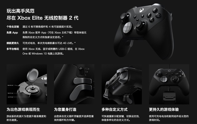 除此之外,全新的Xbox Elite无线控制器2代可通过Xbox无线、蓝牙或是附赠的USB-C缆线在Xbox One或Windows 10平台上玩游戏,同时内置有可充电电池以及多种耐用组件,最长续航时间可长达40个小时。
