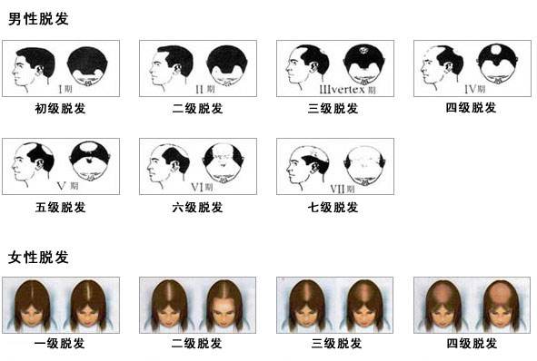 女性一级脱发为正常头发;二级脱发中分处看到少许头皮;三级脱发中分处看到明显头皮裸露;四级脱发中分处头皮范围扩大;五级脱发中分处周边稀少范围扩大;六级脱发头顶形成马蹄状的脱发带;七级脱发马蹄状的脱发带范围扩大。