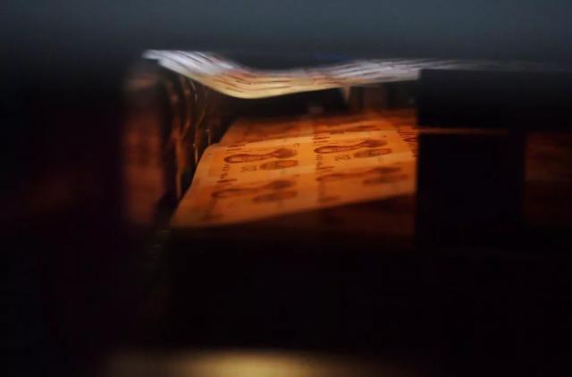 第二道工序是凹印,真钞所特有的凹凸感即来自于这种印刷方式。这是一道核心工序,凹印图纹具有明显的立体感、层次感和凹凸手感,防伪性能突出。钞票中的毛主席人像、行名、国徽、背面主景图案、行长之章、年号等重要图案均采用凹印印刷。