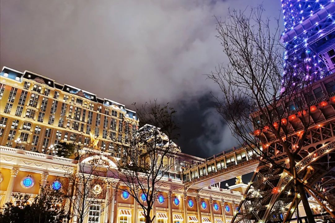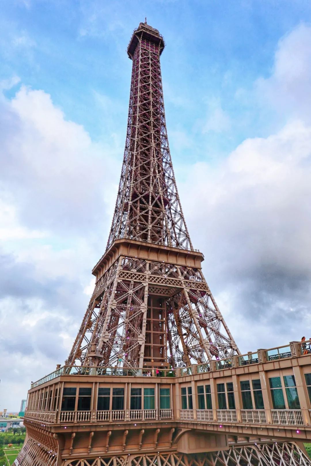 碧空蓝天下,澳门巴黎人度假村正门广场前,这座以法国巴黎埃菲尔铁塔原建筑1/2比例复制而成的巴黎铁塔,是现时全球最高且最忠于原建筑的复制品,也成了澳门的旅游地标,繁复的钢铁结构和铆钉装饰,优雅挺拔的建筑线条,每一分都带来了超时空感的法式浪漫!