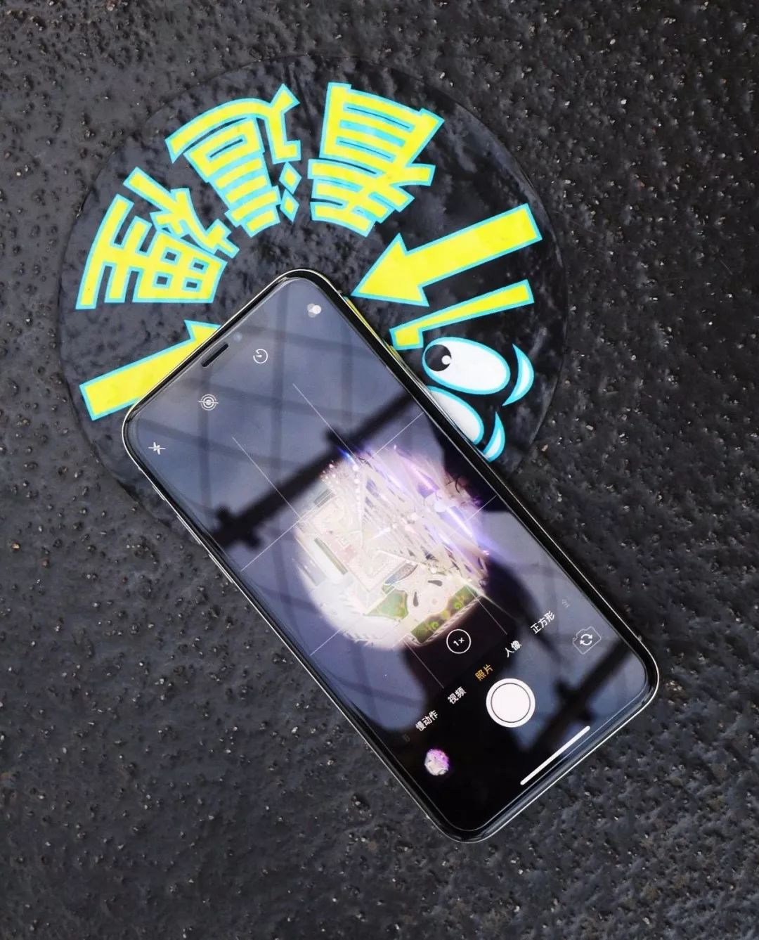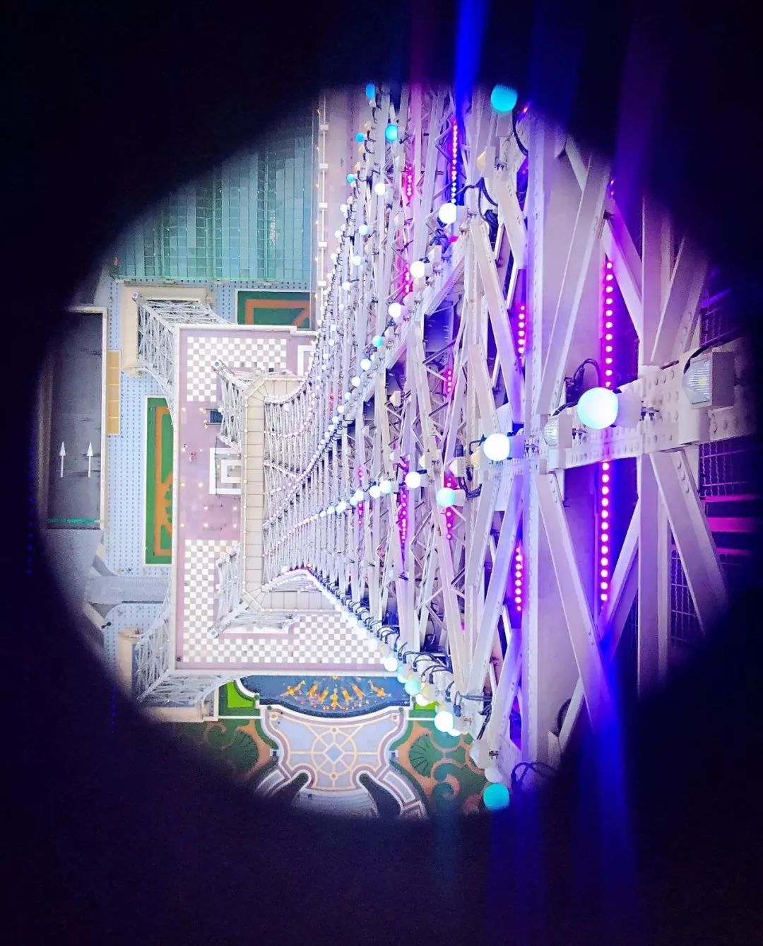在观景台的地板上,还设置了手机拍照透视孔,把手机摄像头覆盖孔上,就可以拍到铁塔塔身的钢架和幻彩灯光,可见酒店方为了宾客的体验花了不少巧心思。