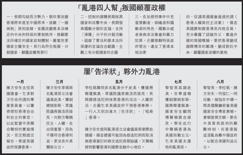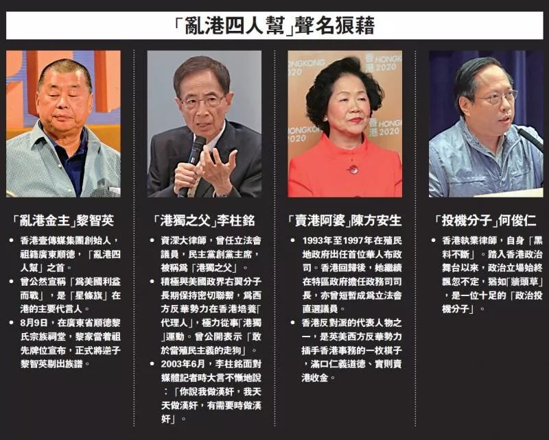 黎智英和民主党创党主席李柱铭、前政务司司长陈方安生、民主党前主席何俊仁等人勾连成帮,沆瀣一气,做尽卖港求荣的汉奸勾当。中共中央政法委官方网站“中国长安网”日前在首页显眼位置发文,点名提到黎智英、李柱铭、陈方安生及何俊仁四人为“祸港四人帮”,力数“十四宗罪”。文章指出,他们正是香港过去两个多月以来,正常秩序持续遭受暴力活动冲击、暴乱分子公然挑战“一国两制”原则底线,摧毁香港经济和民生的罪魁祸首。