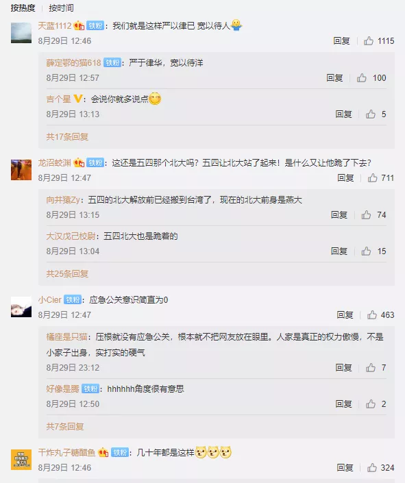图片一经发出,便立即在各个社交平台引发热议,网友几乎一边倒地对北大这种做法表示不满,微博认证为中国社科院研究生院教授的习五一就此评论称:“‘以洋为贵’的管理方式,实在不得人心!”北京本地生活号“北京在你身边”则直接质问:“北大,你什么意思?”