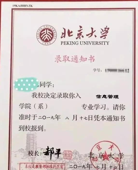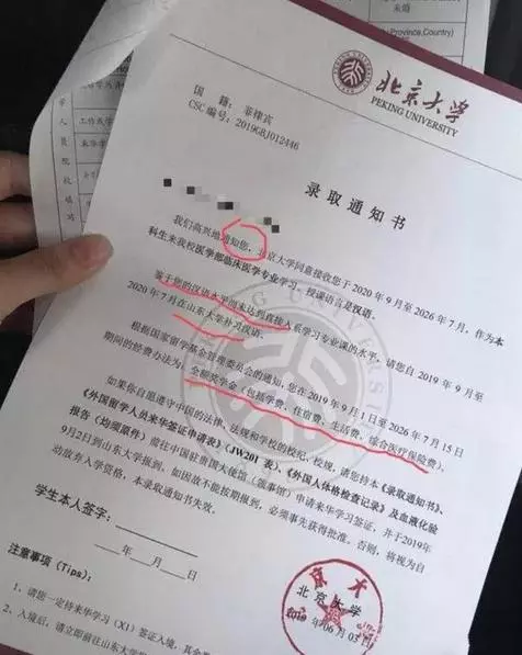 注意到,在连续三年的通知书上,北大都对国内学子称“你”;而在一张今年对一名菲律宾学生的通知书上,北大则称呼这名学生为“您”,通知书还显示,这名留学生汉语不达标,需要先到山东大学补习一下汉语。
