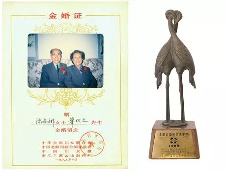左:华明之与沈安娜金婚证 ;右:金婚获奖交颈鹤