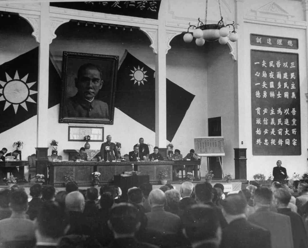 1948年4月4日,蒋介石在南京丁家桥国民党中央党部礼堂主持国民党中央全会,主席台右二为沈安娜。这张照片同年4月14日发表于《中央日报》。