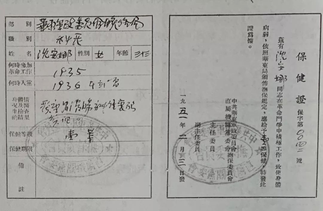 1951年沈安娜的保健证,上面注明患“严重胃溃疡、神经衰弱、贫血”。