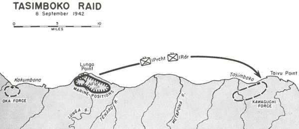 日军驱逐舰大规模向瓜岛增兵不可能不引起范德格里夫特的重视,土著侦察队又发挥了重要作用,他们报告在太午角的塔辛姆波科村发现300名日军。9月8日早晨5时20分,第一突击营813人搭乘两艘驱逐舰和两艘炮艇在该村附近登陆,守军仅为野战炮兵第2联队的一个中队,他们很快溃散并丢下大量物资,遭美军付之一炬。