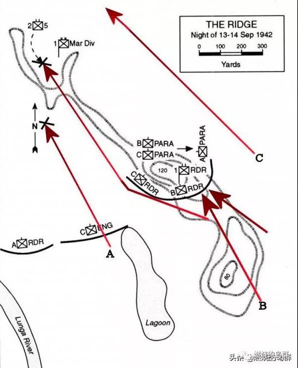 图29. 9月13日晚,日军将美军驱赶至123高地,并有一部绕过美防线向机场冲去