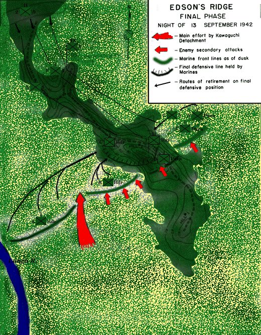 西侧冈部队在13日晚22时向陆战五团三营的阵地发起进攻,毫无进展,海军的舞鹤第4特别陆战队400人接着投入进攻,同样是白送死。在接到川口“暂停进攻”的命令后,日军抛尸200余具退出丛林,美军仅亡4人,伤3人。