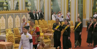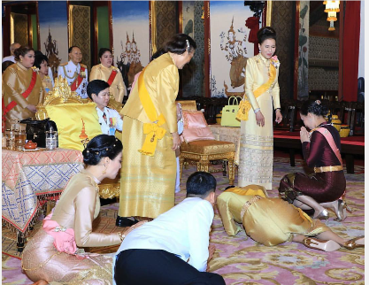 仪式完毕之后,身为王后的素提达对着两位公主,依旧俯身跪拜,诚心谦卑的仪态看了让人不仅对这位新王后心生好感。的确,泰国王室一大半公务都是靠公主们支撑起来,这个礼她们当之无愧受得起,可见王后内心还是非常聪慧识大体的。