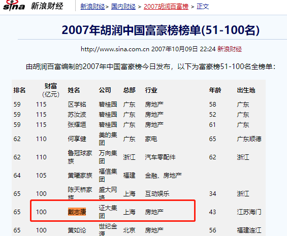 2004年,戴志康凭借17亿的身价,在胡润百富榜中排名57,2007年戴志康排在第65位,身家100亿。