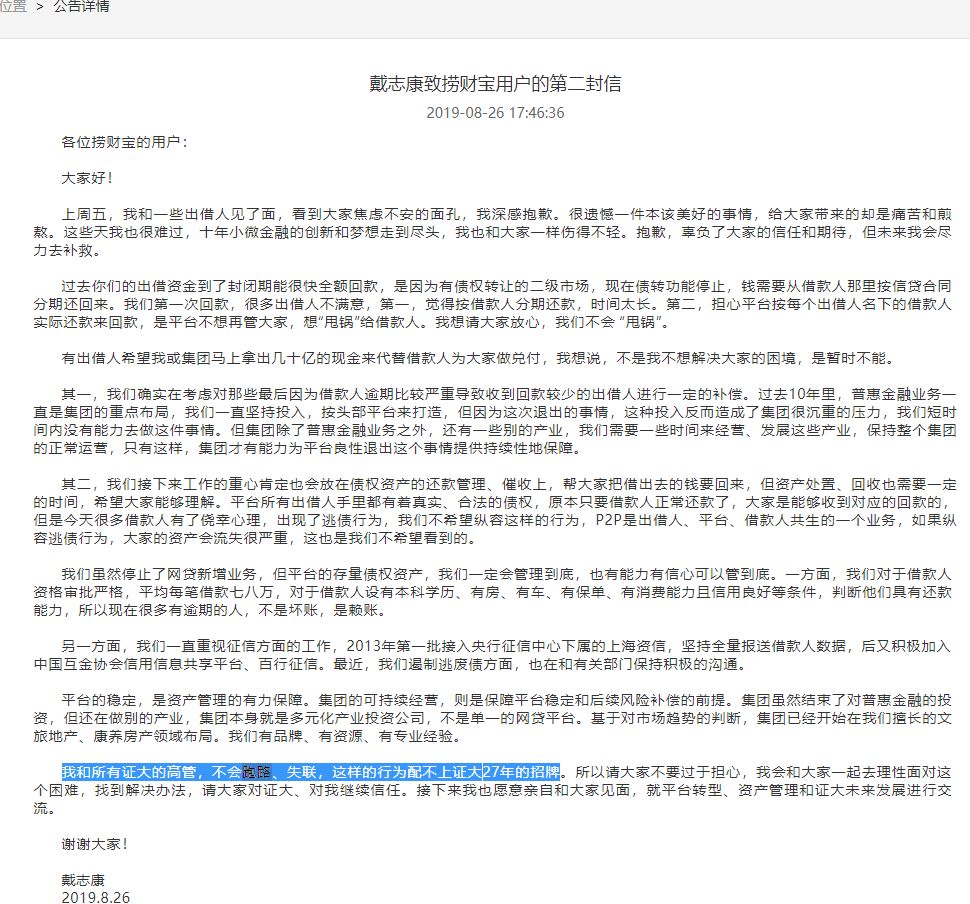 此前不久8月26日,捞财宝官网发布戴志康致捞财宝用户的第二封信,明确表示不甩锅、不跑路、不失联,接下来的工作重心会放在债权资产的还款管理、催收上。
