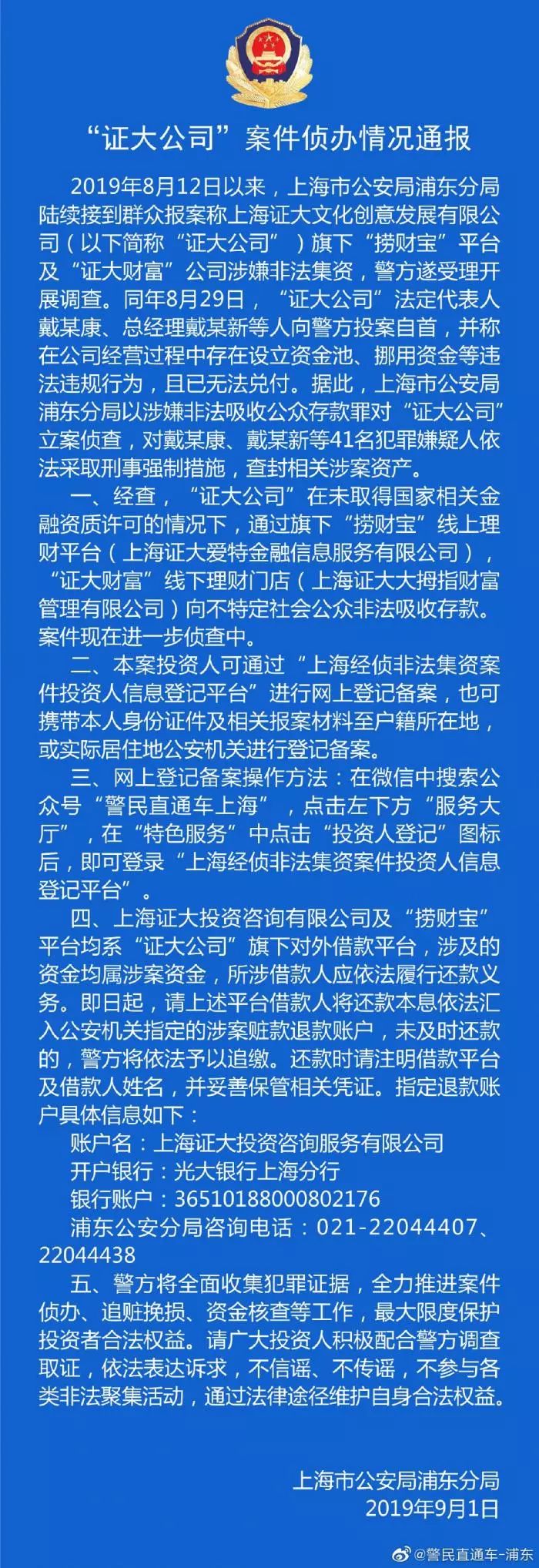 9月1日,上海市公安局浦东分局在官方微博“警民直通车-浦东”发布了《关于“证大公司”案件侦办的情况通报 》。