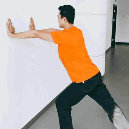 上身挺直,双手前伸扶住墙壁; 两腿一前一后,前腿弯曲,后腿伸直,脚跟着地。