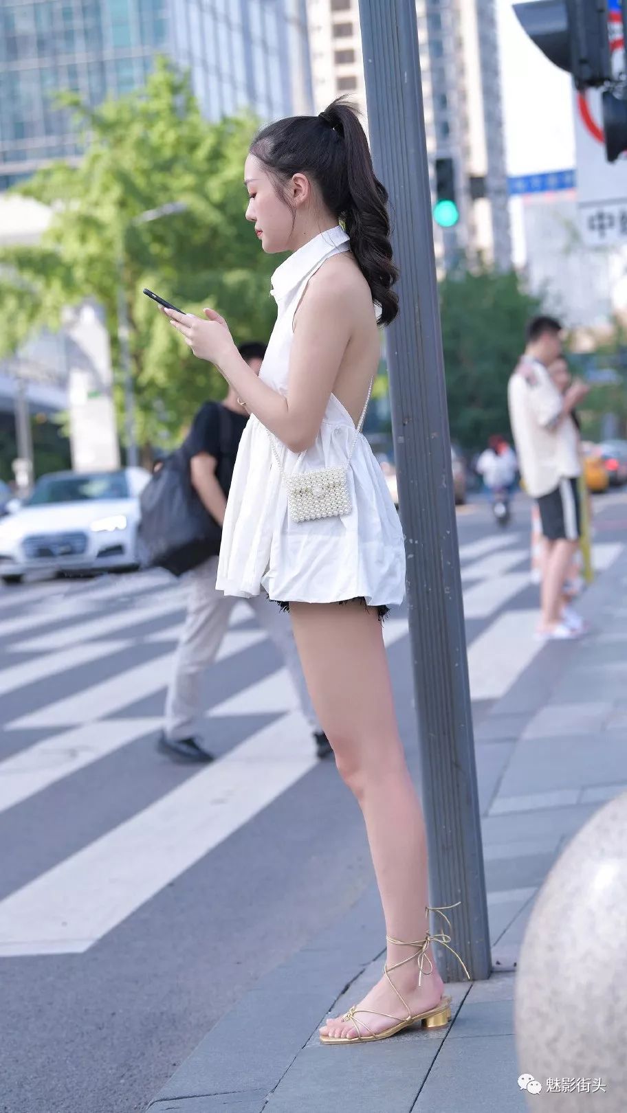 站在街边玩手机的美女,身材高挑气质出众,一束马尾高高扎在脑后,凸显了精致的面容。小姐姐穿了一件白色挂脖衬衫,衬衫采用了露背设计,清凉舒适的同时也提升了性感力。下半身穿一条黑色牛仔短裤,搭配一双金色高跟凉鞋,这款凉鞋加上绑腿设计,简单清凉舒适的同时,时尚度也得到了提升。