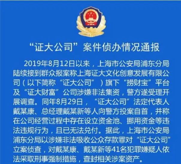 第一、2019年8月12日以来,上海市公安局浦东分局陆续接到群众报案称上海证大文化创意发展有限公司(以下简称“证大公司”)旗下“捞财宝”平台及“证大财富”公司涉嫌非法集资,警方遂受理开展调查。