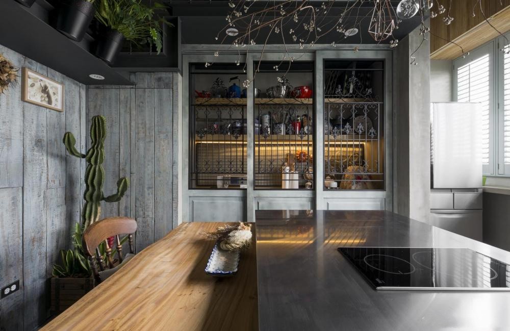 其实铁窗花不只能作为防盗窗使用,还可结合刷旧感木作成为门片使用,铁窗花的弯曲雕花配上刷旧感的手刷纹路,隐隐带出欧洲中古世纪的庄园复古感,让空间中漫着欧洲的优雅古韵。