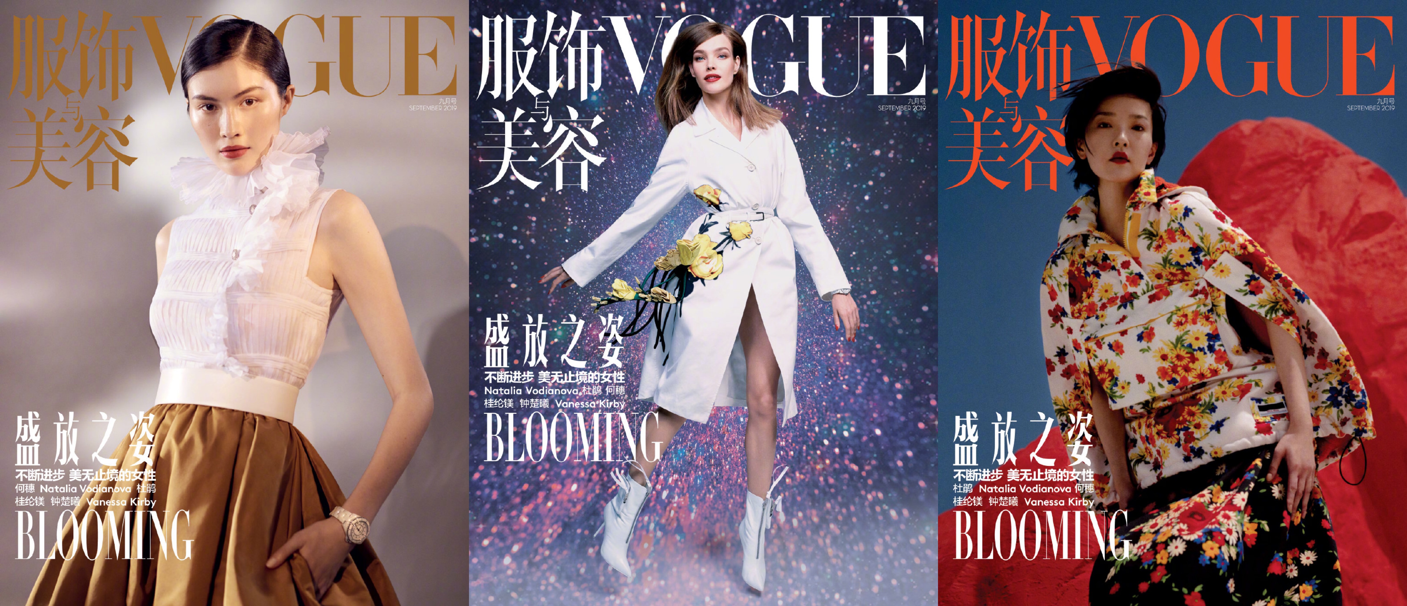 《VOGUE服饰与美容》为庆祝杂志创刊14周年,同样邀请了三位超模一起登封,包括国际超模Natalia Vodianova、中国超模杜鹃以及何穗。封面以“盛放之姿”为主题,展现女性不断进步的精彩人生。然而,三位超模合体却没有得到部分网友的认可。