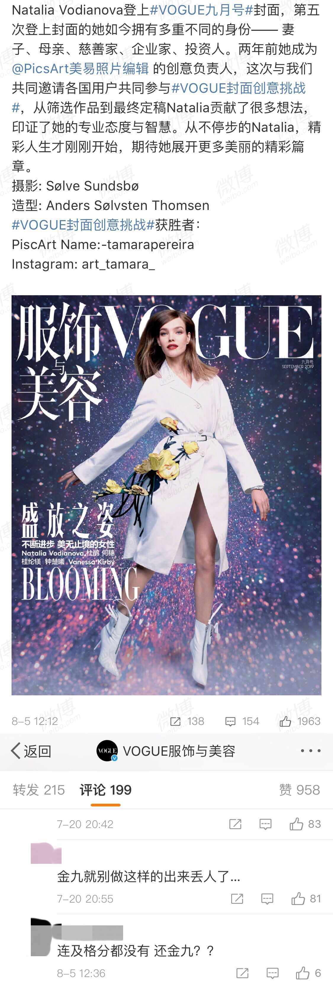 三人的单人封面似乎也没能为VOGUE扳回这一局,槽点集中在Natalia Vodianova的梦幻星空背景上。