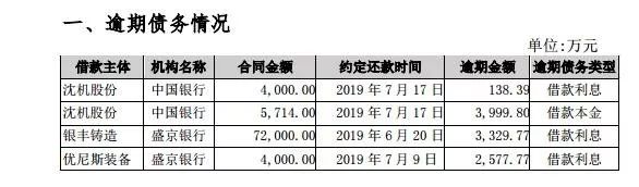 在7月26日,沈阳机床就发布一则公告,宣布四笔银行借款出现了部分逾期状况。这四笔银行借款的出借方分别为中国银行和盛京银行,合同金额合计约8.57亿元。其中,有三笔借款出现了利息逾期,一笔为借款本金逾期,四笔借款涉及的逾期金额合计约1亿元。