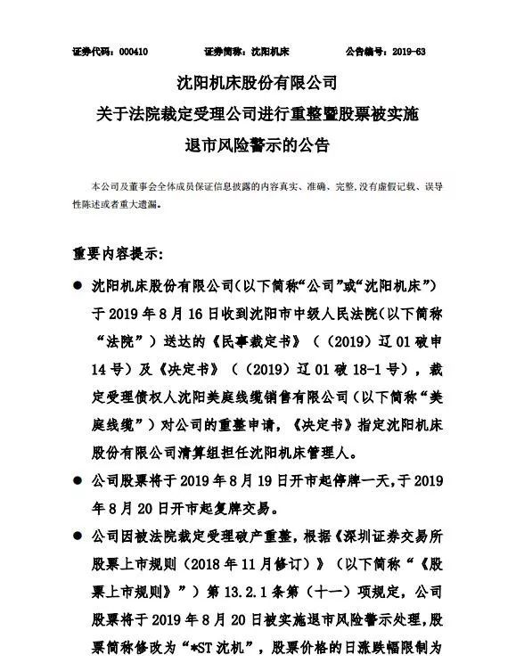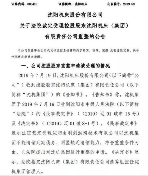 值得一提的是,沈阳机床的控股股东沈机集团,已先上市公司一步走到了破产境地。7月23日晚,上海清算所发出公告,因无法清偿到期债务、明显缺乏清偿能力,沈机集团正在被债权人申请破产重整,且该申请已被法院受理。