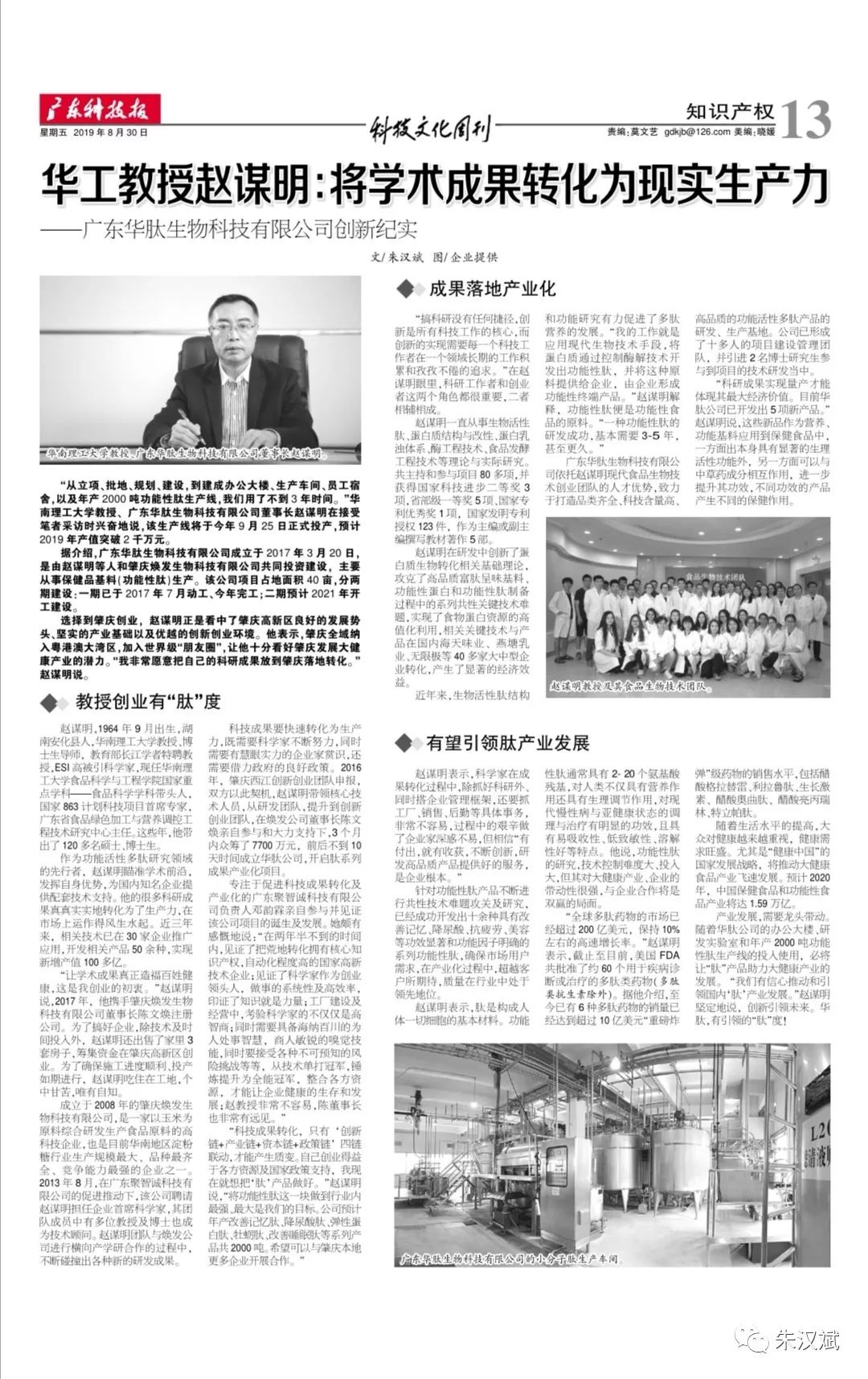 科技成果要快速转化为生产力,既需要科学家不断努力,同时需要有慧眼实力的企业家赏识,还需要借力政府的良好政策。2016年,肇庆西江创新创业团队申报,双方以此契机,赵谋明带领核心技术人员,从研发团队,提升到创新创业团队,在焕发公司董事长陈文焕亲自参与和大力支持下,3个月内众筹了7700万元,前后不到10天时间成立华肽公司,开启肽系列成果产业化项目。