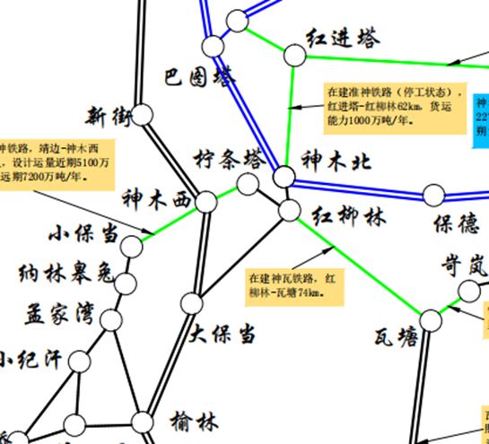 目前在建4个(小保当装煤线、曹家滩装煤线、金鸡滩支线、高家伙场集装站,目前小保当、曹家滩装煤线由靖神铁路代建,计划年底前建成。金鸡滩支线已开工建设,计划与靖神铁路同步建成,对应4个煤矿核准产能为5100万吨/年加上智能物流园区项目外运量,铁路运量为4900万吨/年),目前均未开通。