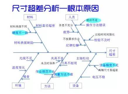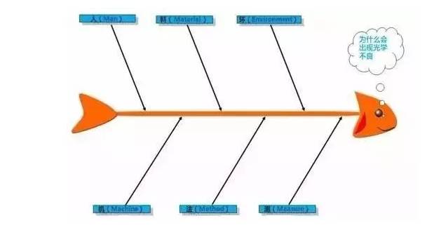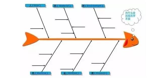 确定大要因(大骨)时,现场作业一般从“人机料法环”着手,管理类问题一般从“人事时地物”层别,应视具体情况决定;