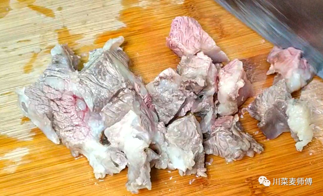 ④:焯好水的牛腩捞出冲凉,切成2cm大小的块,备用。