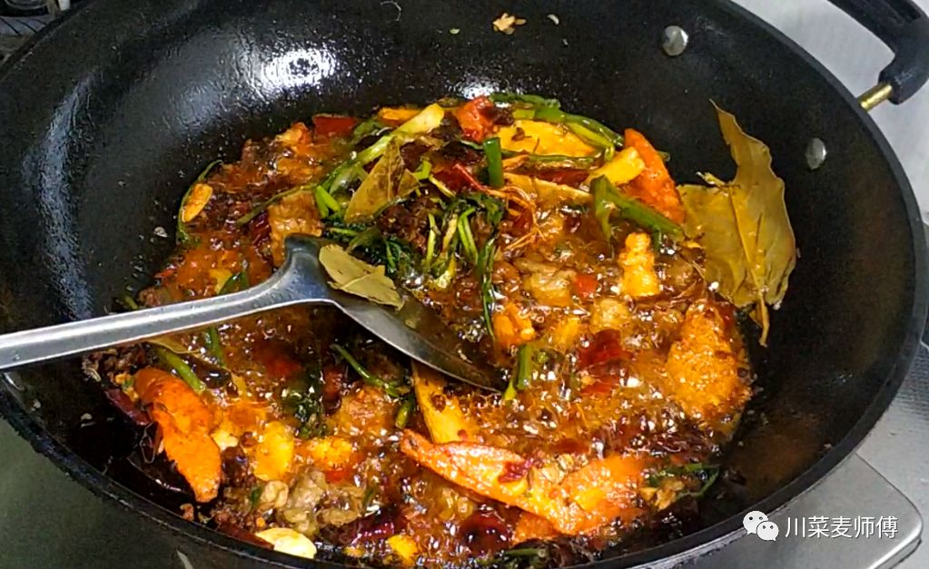 ②:下入小葱香菜煸炒,炒干水分炒香!然后下入干花椒干辣椒,煸至辣椒棕红色后,将香料滤水后下入锅中煸干水气后下豆瓣酱50克,煸香后下火锅底料和香辣鱼调料。