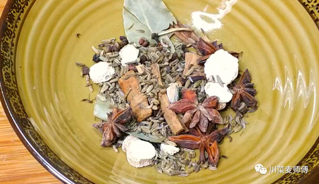 【香料】:香叶5片、桂皮约5克,八角4个、山奈4克,丁香2克、陈皮5克,白扣3克,小茴香10克,加温水浸泡,一般浸泡10分钟即可。