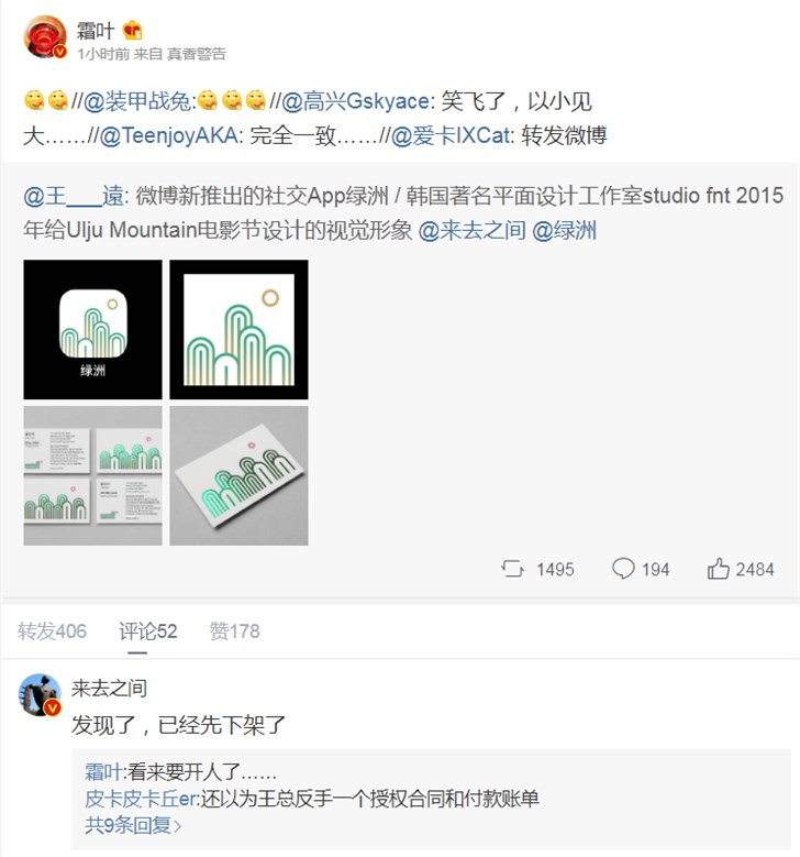 此次绿洲在App Store下架,或许与logo涉嫌抄袭有关。微博CEO王高飞“来去之间”在一条关于绿洲App logo涉嫌抄袭韩国平面设计工作室studio fnt 2015年给Ulju Mountain电影节设计的视觉形象的微博下方评论称,“发现了,已经先下架了。”