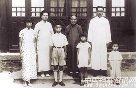 1935年,冯友兰全家在清华大学乙所院中合影。后排中为吴清芝,左为任载坤,右为冯友兰。首排四子女,左起:长女冯钟琏,长子冯钟辽,次女冯钟璞,次子冯钟越。