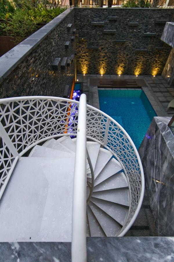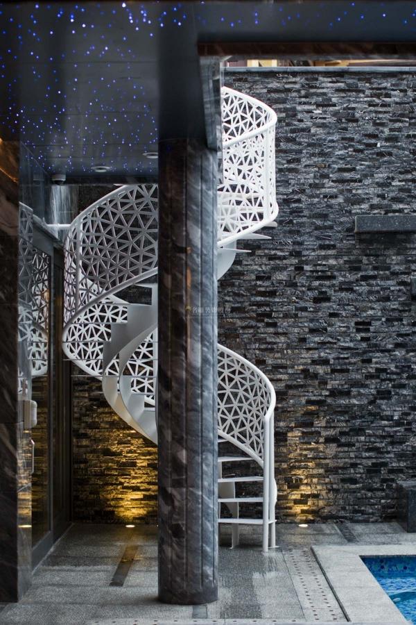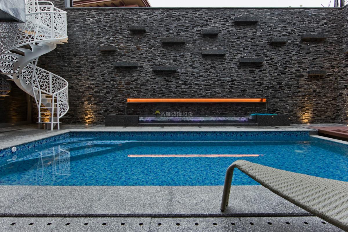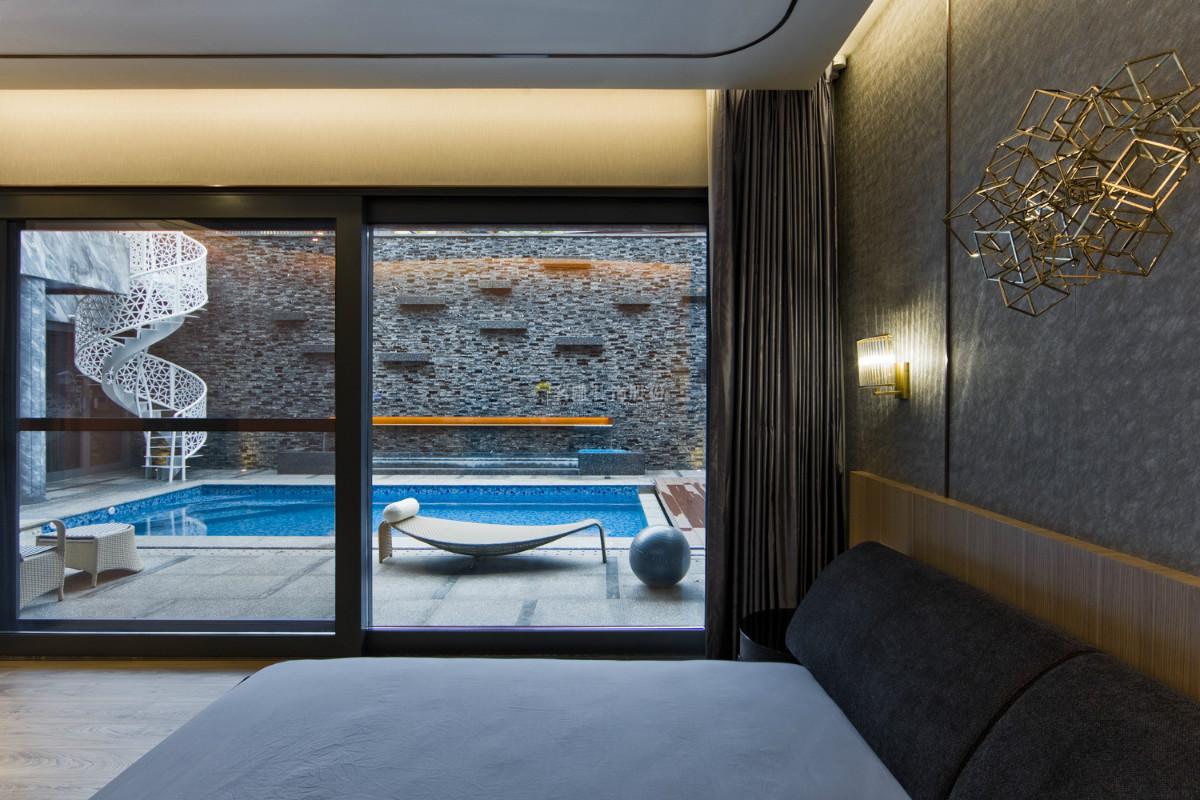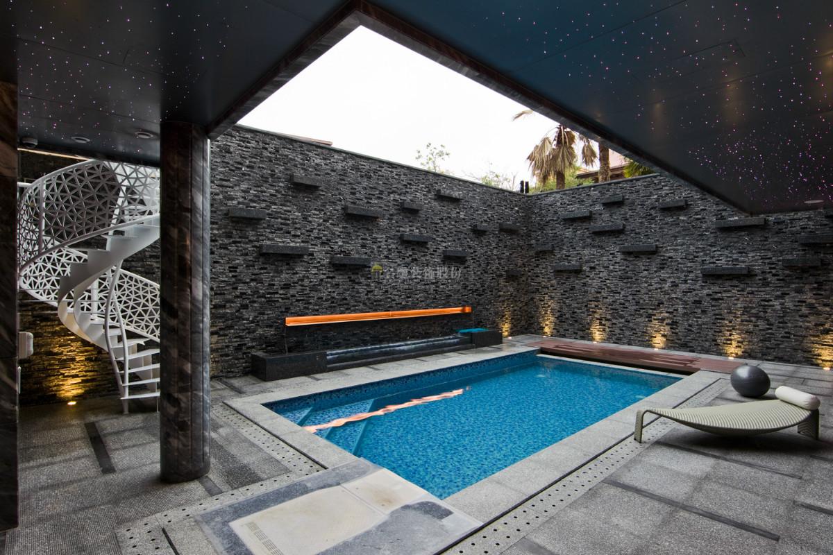 负一楼的整体是休闲功能为主,酒吧、影视、健身、麻将室等等,还有一个大大的泳池碧蓝池水与岩壁式的墙体相呼应,仿佛岩山涧流水,一缕清香幽静。