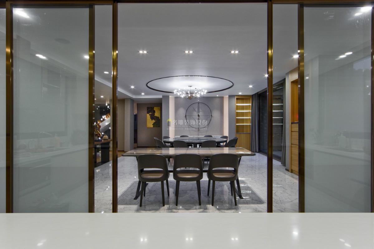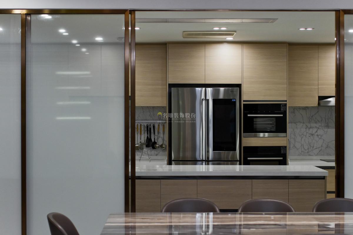 宽大的餐厅与厨房相连,仅用极细边框的玻璃推拉门隔开,运用实木皮与大理石的自然元素,并把花园与后山的景观引入室内,使人心旷神怡。