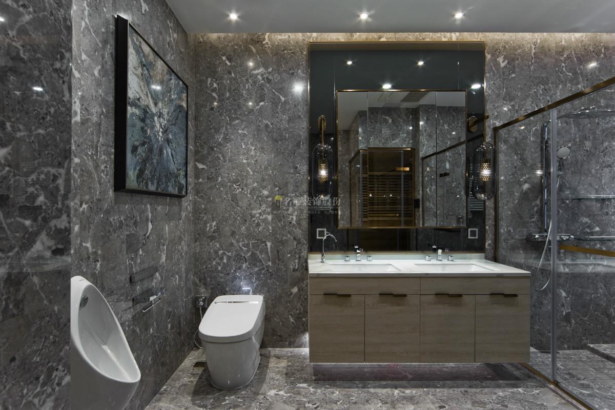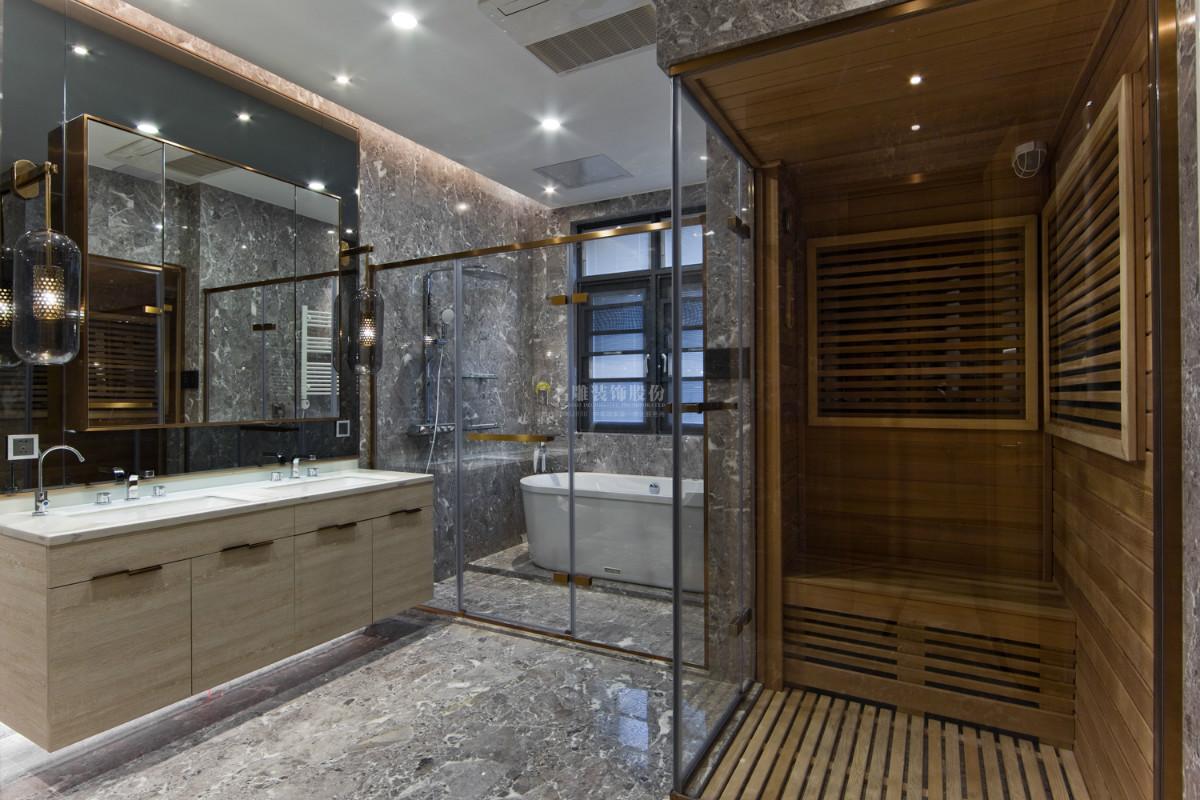 深灰色不规则纹理的大理石墙面地砖,透明玻璃做干湿隔断,原木材质的简约浴室柜、一幅挂画。简单的装饰,是主卫明亮舒适宽敞。