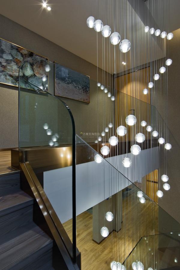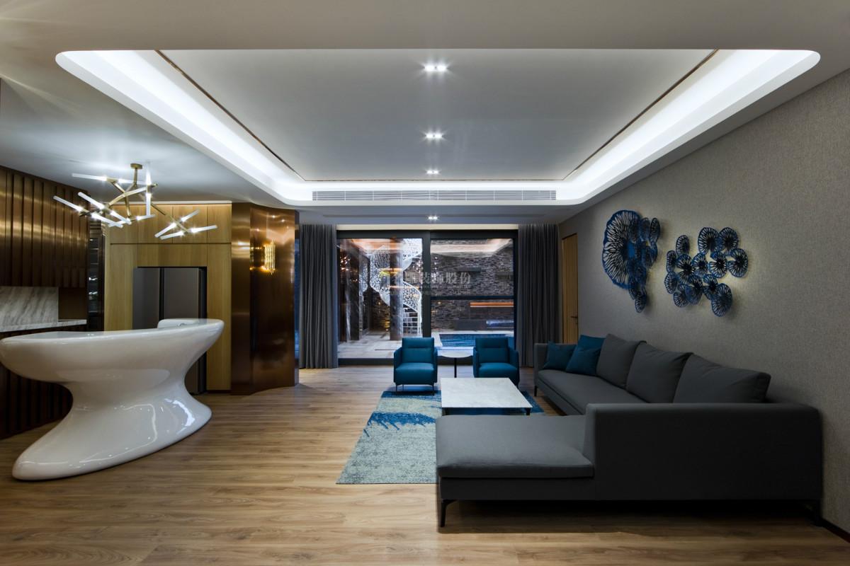 地下一层客厅,圆滑的亚克力吧台,利用灯带和筒灯的灯光效果,与金属感的墙面设计相互碰撞,搭配简约的灰色布艺沙发和原木地板,是奢华与简约的碰撞融合。