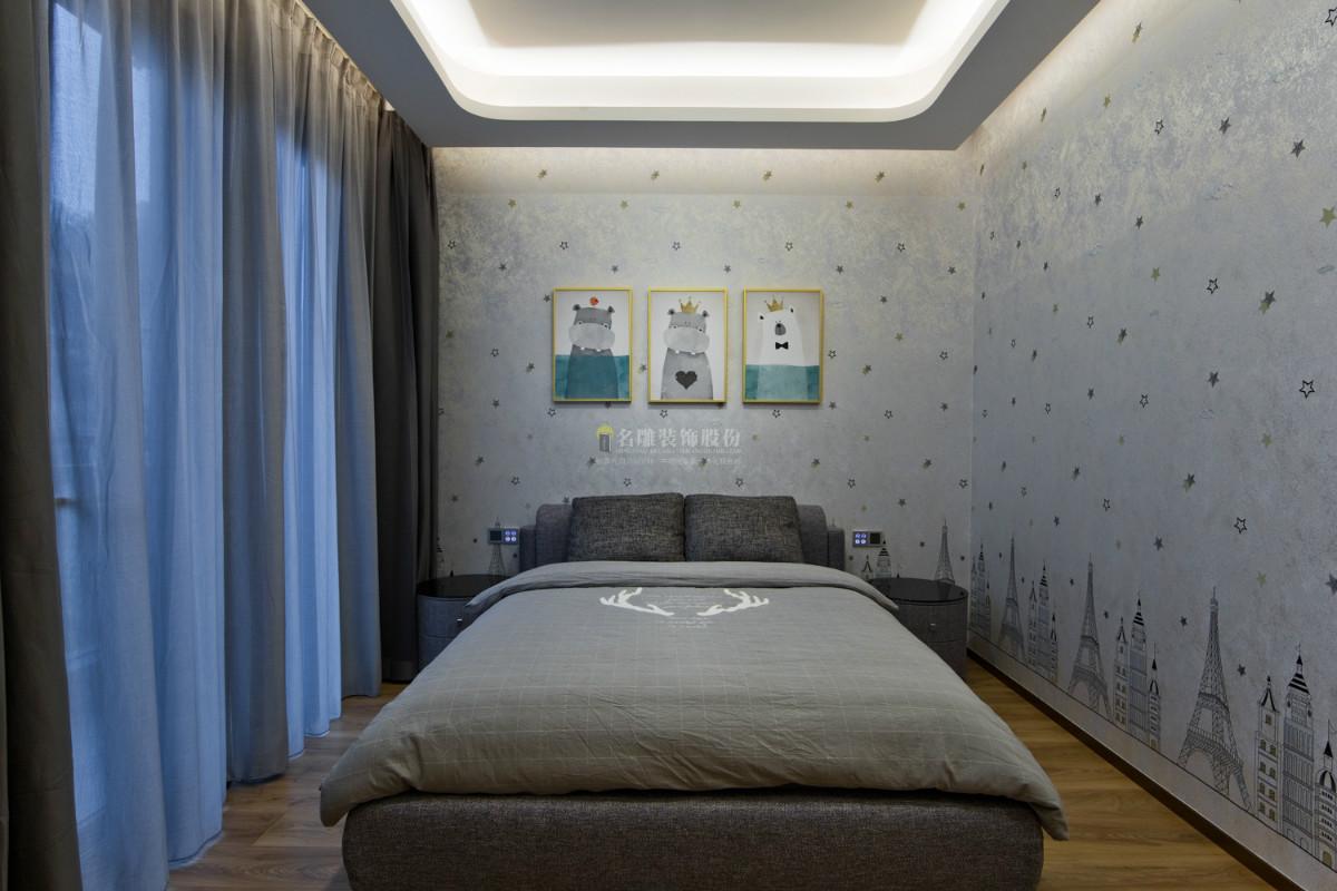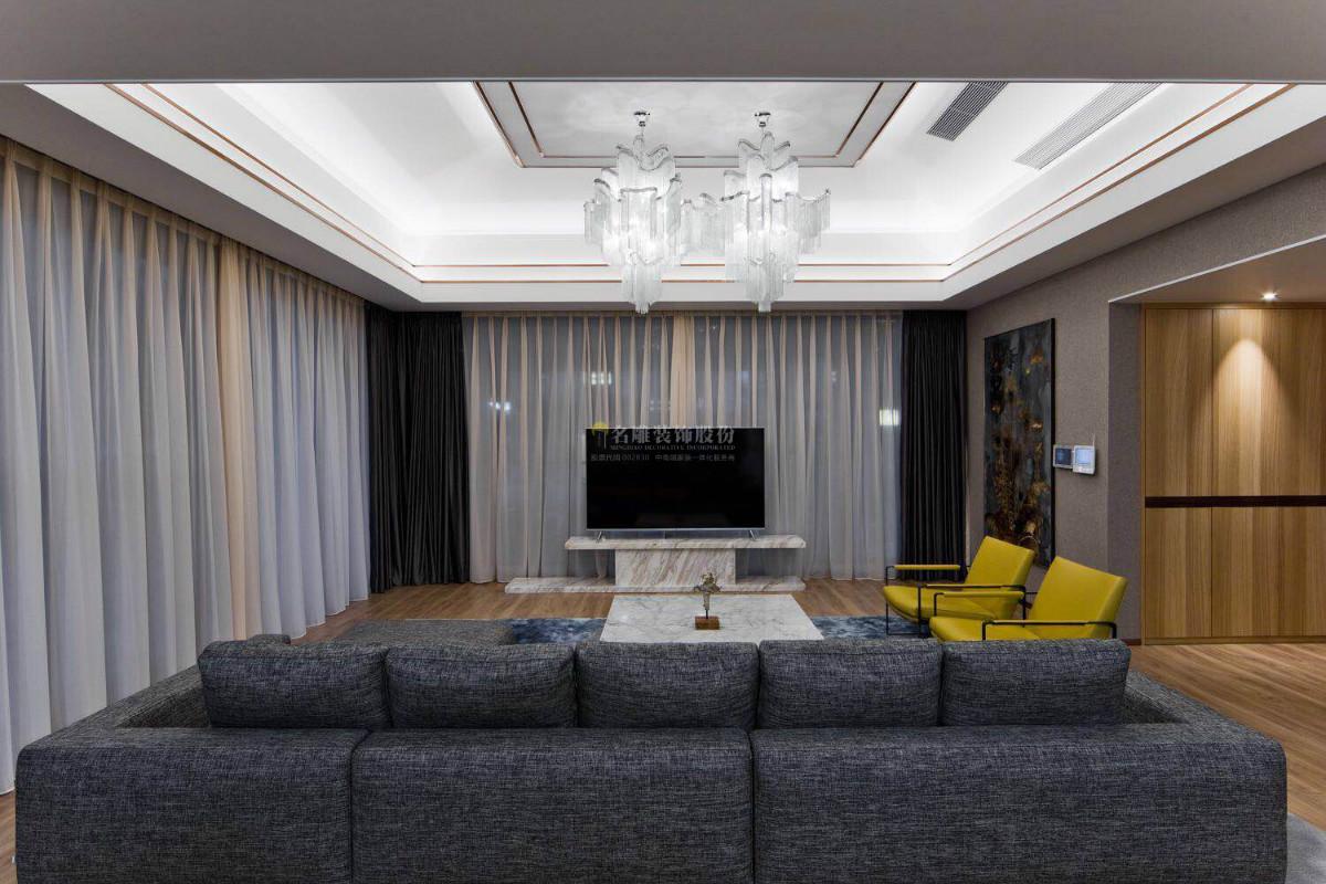 长方形的户型结构,灰白作为主色调,灯带作为房间主光源。大落地窗的设计,增加室内空间的视野延伸。