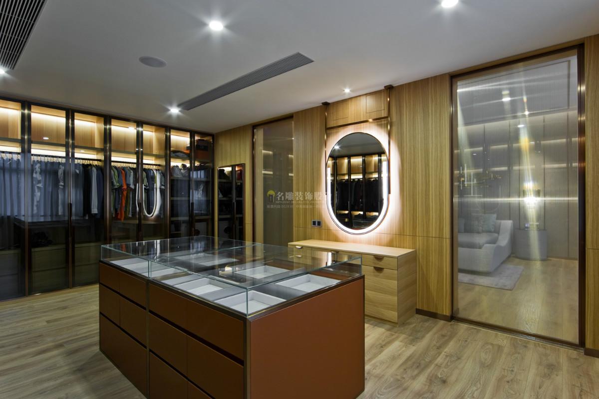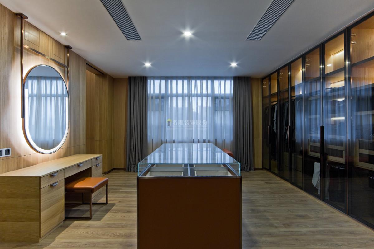 这种步入式独立衣帽间简直是所有女孩子一生都向往和喜爱的空间,独立摆放首饰品的玻璃台柜、亚克力玻璃作为衣柜门,整齐排列的衣服,,每天要穿什么都安排的明明白白的。合理舒适的功能划分,嵌入式强收纳的设计,使得衣帽间干净整洁。