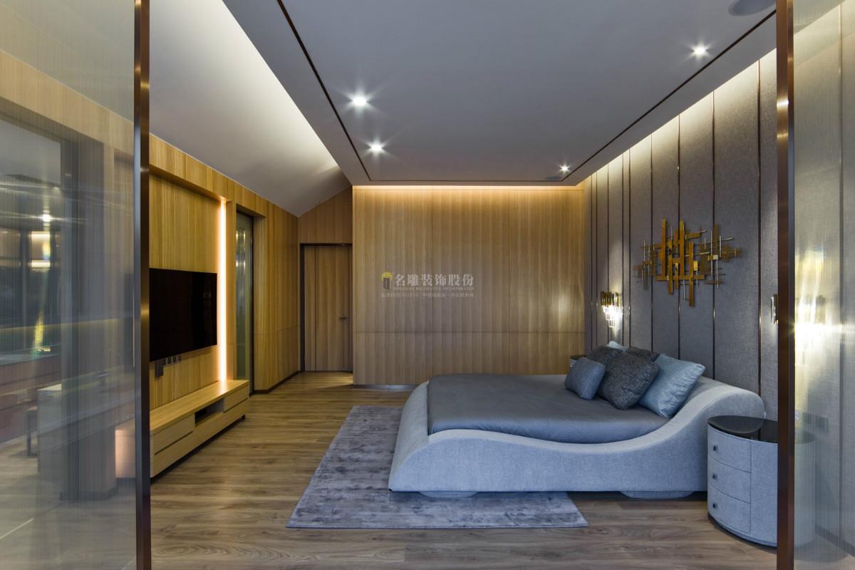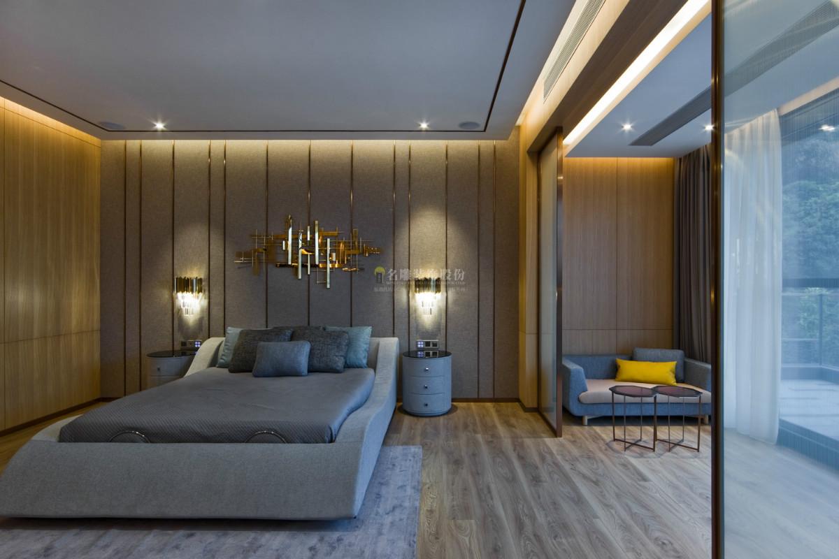 主卧大量使用原木材料装饰,没有主灯源,采用灯带、筒灯、壁灯与装饰元素的效果碰撞来营造卧室的温馨氛围。灰色硬包背景墙,与床、床柜和地毯同色系,整体温馨舒适,略带轻奢感。