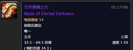 这是当年著名的DK剑,斯坦索姆最后BOSS瑞文戴尔男爵出品。属性非常优秀的双手剑,59秒伤下,3.6的攻速也不算差,特效的移动速度增加效果在PVP中也很强。基本是进入团本之前最强的双手剑。正因为如此,男爵曾经创造过全球每天被击杀200多万次的最高纪录——成了魔兽世界里名副其实的挺尸专业户。不知道本次怀旧服开启后会不会破纪录呢?